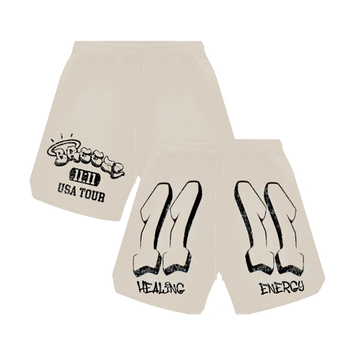 Breezy 11:11 USA Tour design printed on tan shorts.